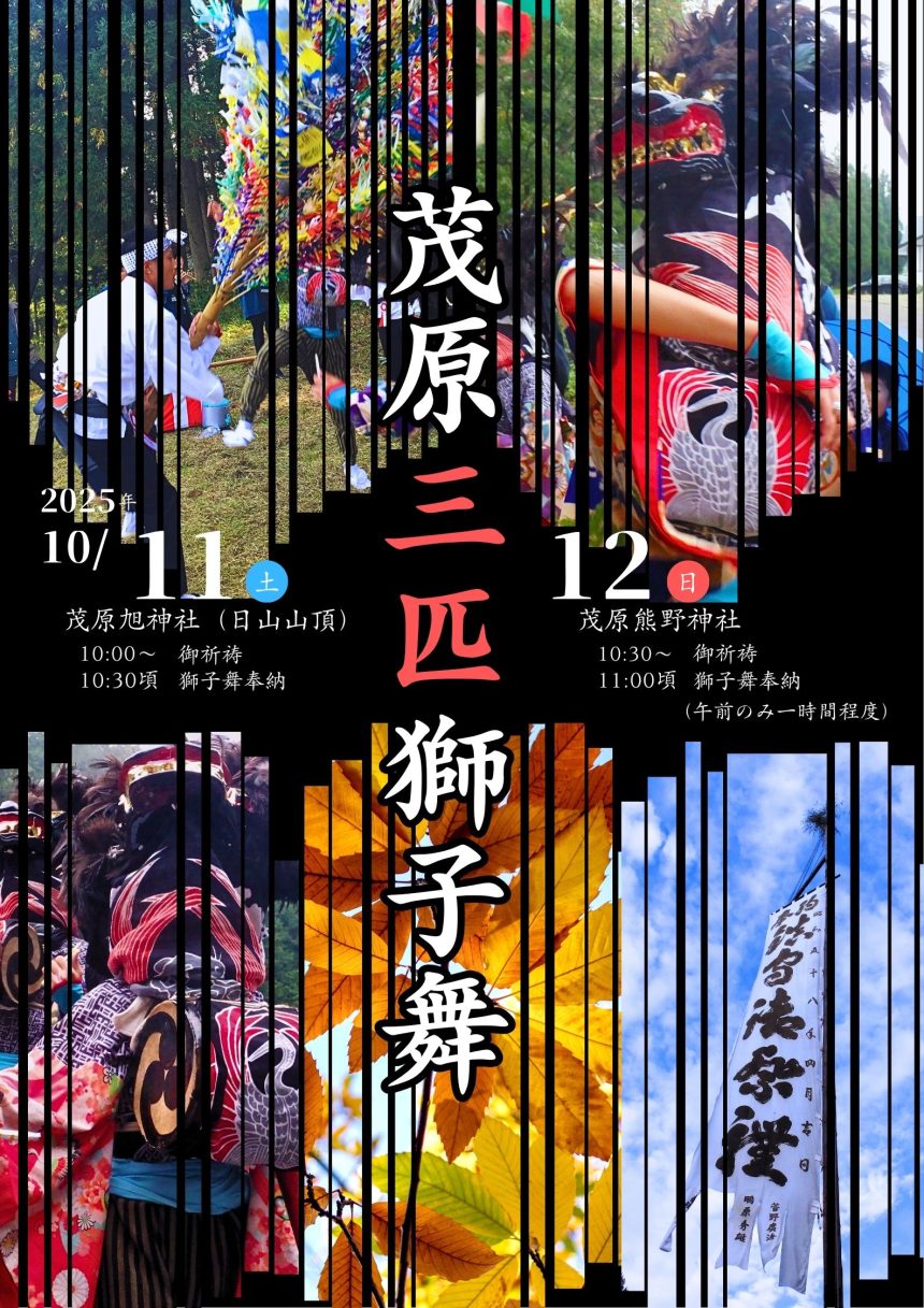 毎年10月上旬、日山山頂では、麓の茂原・田沢地区に伝わる三匹獅子舞が奉納されます。「花吸いがかりの獅子」ともいわれる獅子舞は、150年程前から行われていることが確認されており、ササラ竹一本を用いる獅子舞は、岩代地域の周辺の獅子舞と異なる特色を持っています。